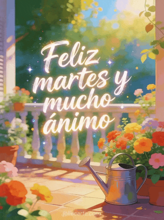 Comparte imágenes gratis de feliz martes con letras radiantes, una regadera clásica junto a flores brillantes en una terraza soleada y partículas de luz. También pueden enviar feliz martes tarjetas virtuales, un feliz martes gif o un martes besos gif.