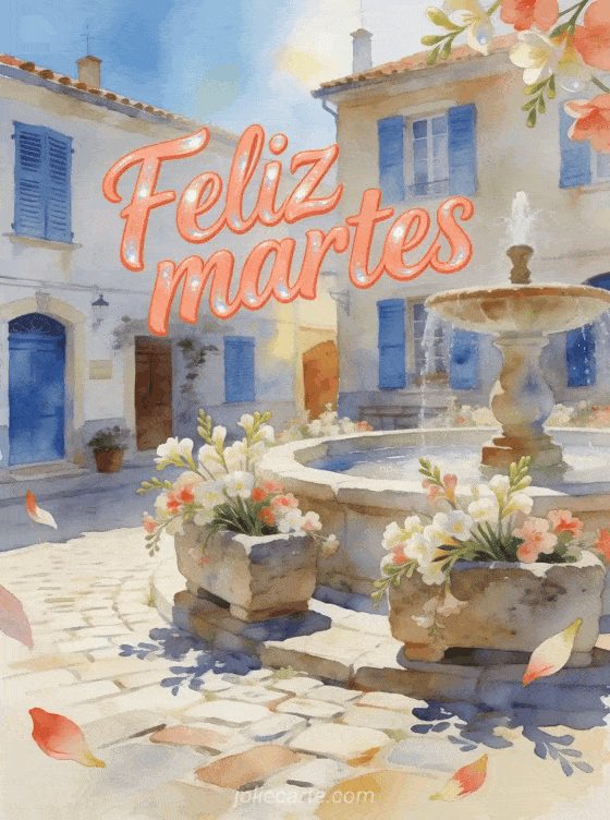 Comparte un feliz martes alegre con letras coral y una plaza de pueblo bañada por el sol. Esta tarjeta gratis muestra una fuente, flores de fresia, persianas azules y adoquines cálidos para crear una escena cercana y brillante. Descubre también un feliz martes gatos gif, unas feliz martes tarjetas o una feliz martes imagen brillante.
