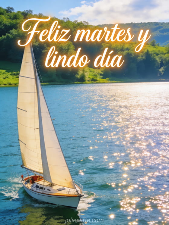 Envía un saludo cálido de feliz martes con escritura elegante y luminosa, un velero en un lago brillante bajo un cielo claro, orillas verdes y luz natural realista. También pueden ver estas feliz martes besos imágenes gratis, esta imagen de feliz martes besos o esta feliz martes humor imagen.