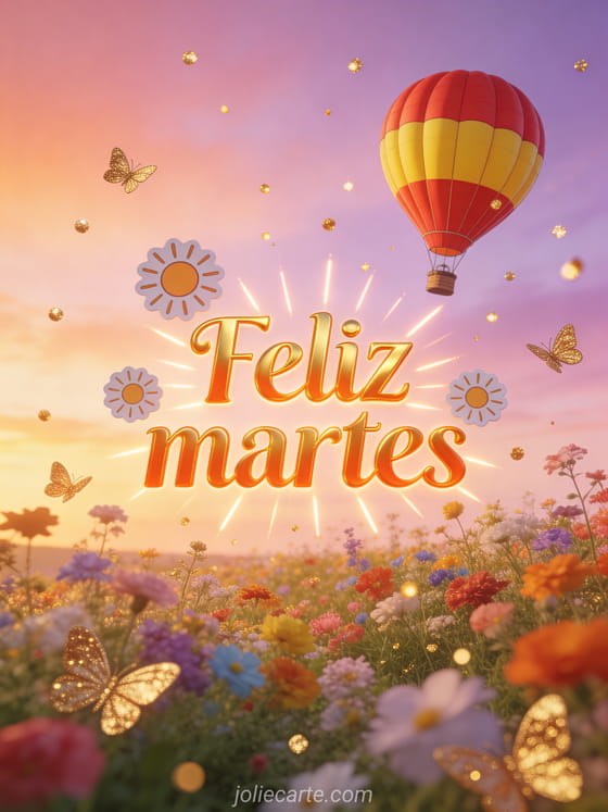 Envíen una tarjeta cálida de feliz martes con letras naranja dorado, pequeños soles, mariposas doradas y un globo aerostático rojo y amarillo flotando sobre un campo florido multicolor al atardecer pastel. Descubran también buen día martes gif, feliz martes paisaje imagen o feliz martes besos imágenes gratis.