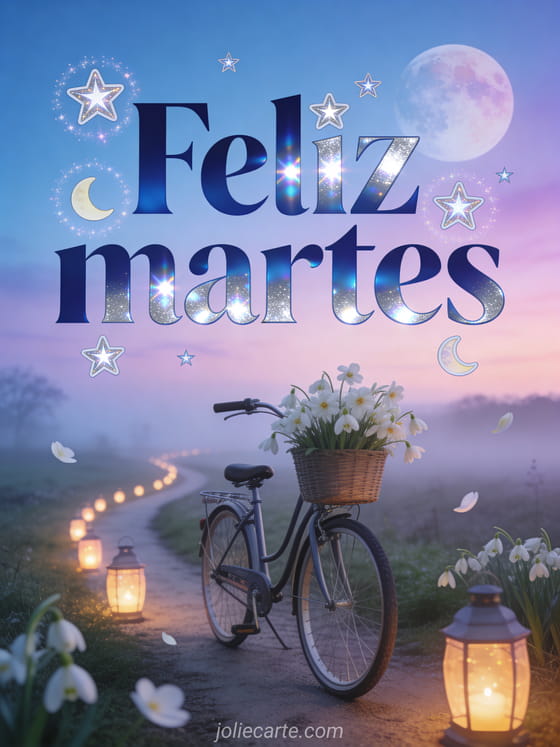 Envíen una tarjeta romántica de feliz martes con letras azul noche, reflejos plateados, estrellas brillantes, pequeñas lunas y una bicicleta vintage con una canasta llena de margaritas blancas en un camino de campo sinuoso durante la hora azul. Descubran también buenos días feliz martes imagen, feliz martes tarjeta o imagen divertida de feliz martes humor.