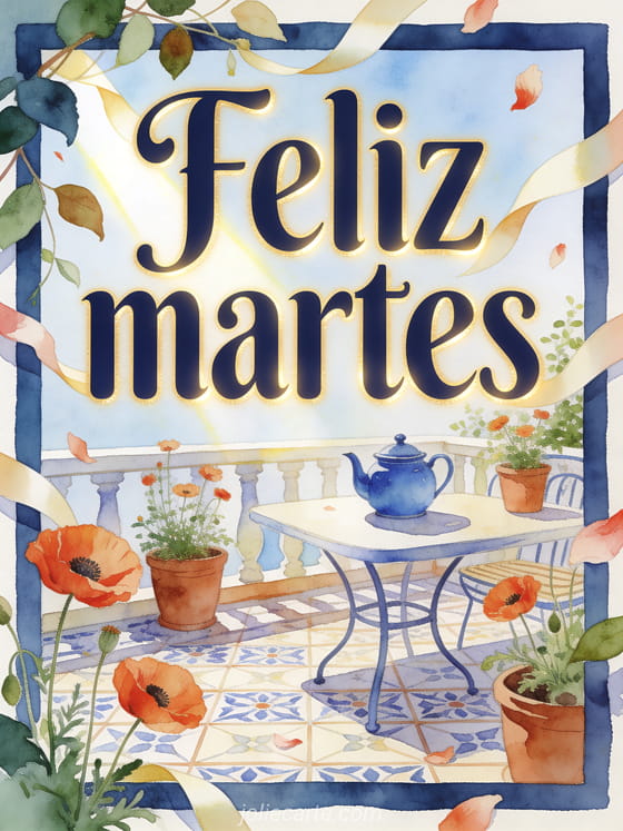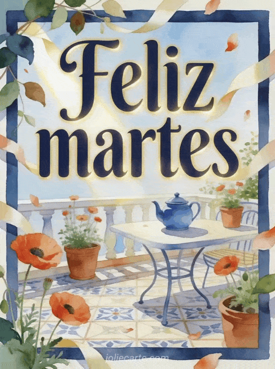 Envía un saludo alegre de feliz martes con una terraza de desayuno soleada, una tetera azul, macetas de terracota con amapolas y azulejos estampados. Descubre también una feliz martes imagen brillante, un buen día feliz martes gif o feliz martes bajo la lluvia imágenes.