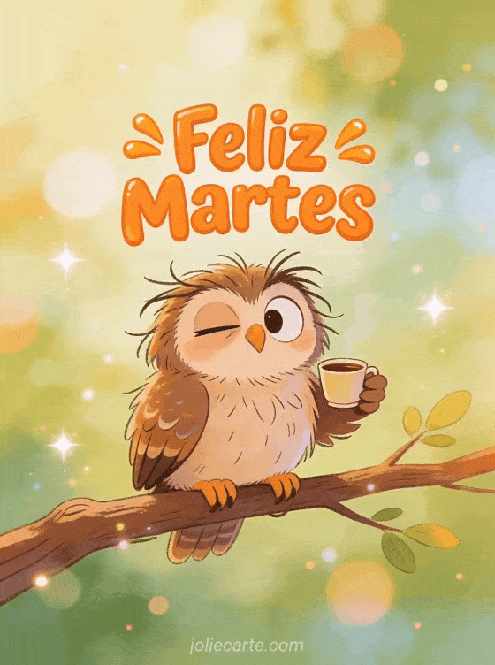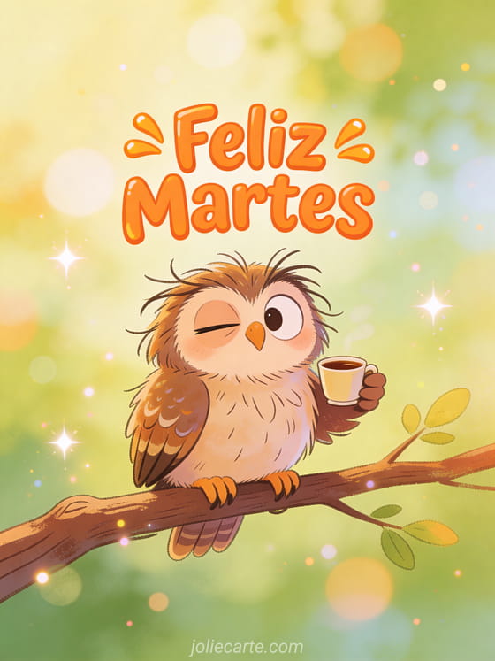 Empieza tu martes con una carcajada enviando esta divertida tarjeta. Un búho con plumas despeinadas sostiene una taza de café con una expresión de sueño muy cómica. Descubre también una tarjeta de buen día o una tarjeta de feliz martes.