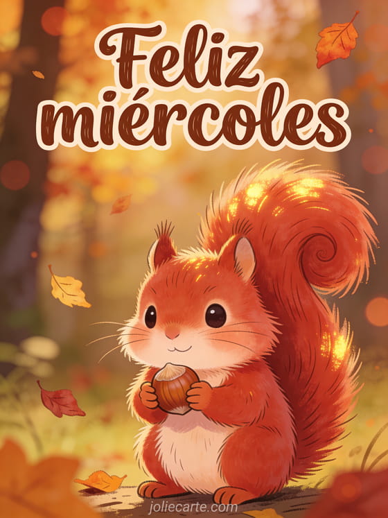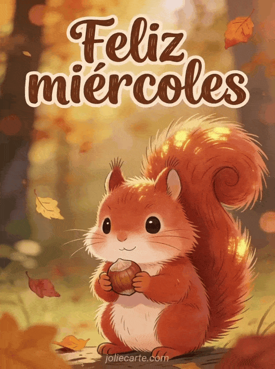 Envía un saludo adorable de feliz miércoles con una ardilla rojiza y esponjosa sosteniendo una avellana, con su cola tupida enrollada en la luz cálida del bosque otoñal. Descubre también feliz miércoles gif animado, cada día pienso en ti yosa prod o corazón corazón ternura feliz miércoles besos.