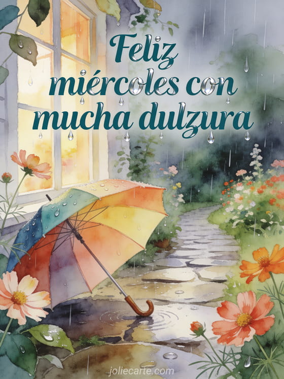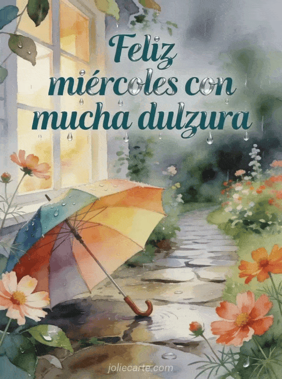 Comparte un gif de feliz miércoles bajo la lluvia con letras verde azulado, flores de cosmos, hojas mojadas, un paraguas abierto y un sendero de jardín besado por la lluvia. También puedes enviar feliz miércoles brillante gif, feliz miércoles sol gif o feliz miércoles imagen búsqueda.