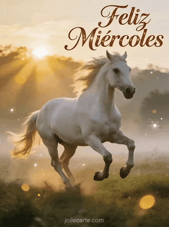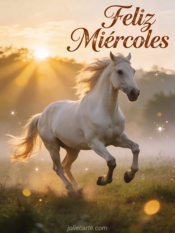 Comparte un inspirador miércoles con esta majestuosa tarjeta del caballo blanco al galope. Descubre también una tarjeta feliz miércoles te quiero o una tarjeta feliz miércoles gif animado.