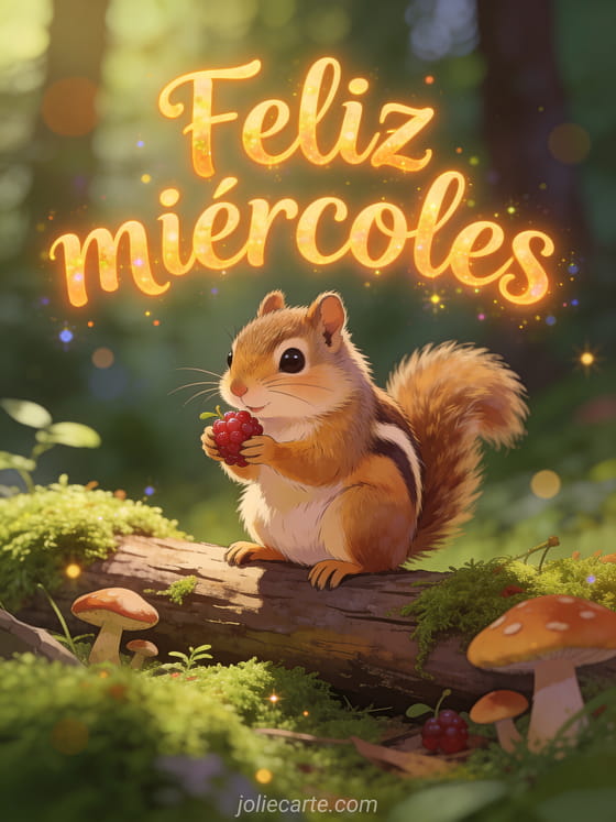 Envía un saludo adorable de feliz miércoles con una ardilla peluda sosteniendo una baya sobre un tronco con musgo, rodeada de hongos y luz filtrada del bosque. Descubre también imagen animada feliz miércoles, buenos días que tengas un buen día buen miércoles o hola feliz miércoles humor.