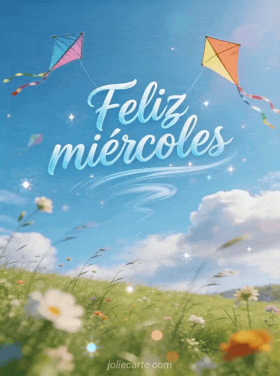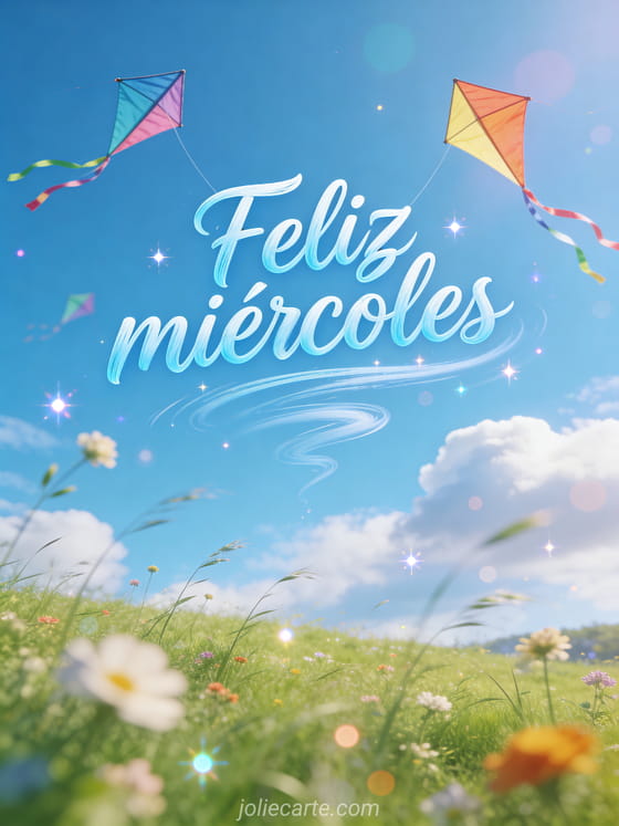 Envía un saludo libre de feliz miércoles con cometas coloridas volando alto en un cielo azul brillante sobre una pradera verde, con nubes veloces y flores silvestres doblándose con la brisa. Descubre también buenos días feliz miércoles imágenes, feliz miércoles soleado imágenes o tarjeta feliz miércoles besos.