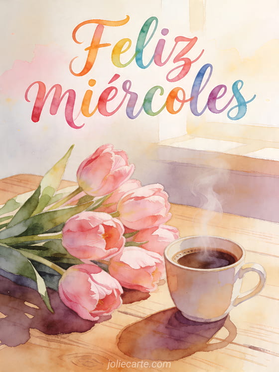 feliz miércoles un saludo acogedor de miércoles con café, flores y luz dorada de la mañana