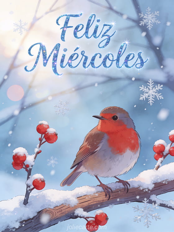 Comparte un sereno saludo de miércoles invernal con esta apacible tarjeta con un encantador petirrojo en una rama nevada con bayas rojas. Descubre también buen miércoles o sms para decir feliz miércoles para más inspiración.