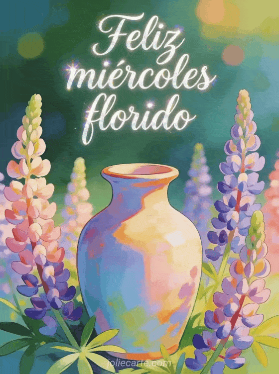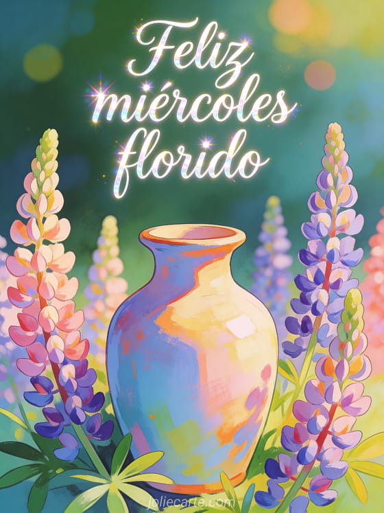 Comparte un saludo colorido de feliz miércoles con letras elegantes, brillos suaves, lupinos en flor alrededor de un jarrón pintado y bokeh primaveral. Descubre también una buenos días buenos días feliz miércoles imagen, unas feliz miércoles fotos o un feliz miércoles ramo.