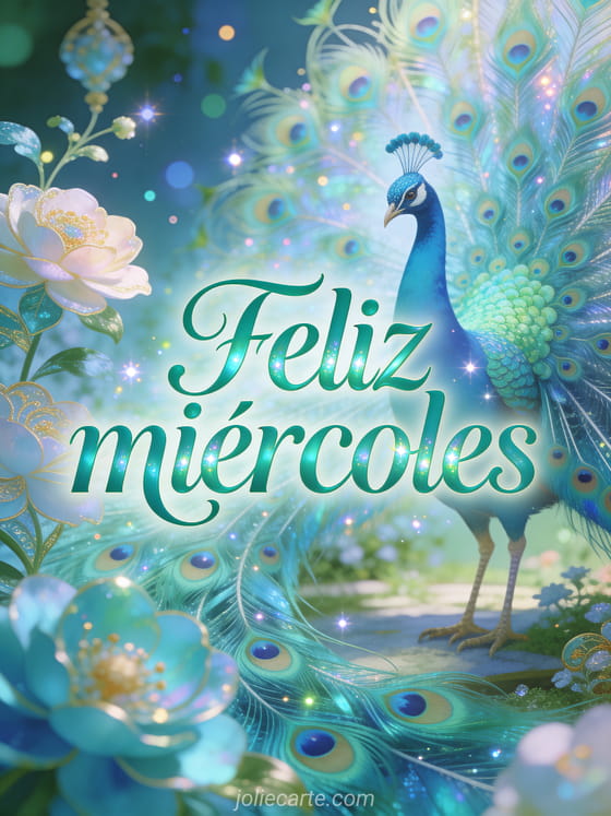 Envía un saludo elegante de feliz miércoles con un pavo real majestuoso desplegando sus plumas iridiscentes en un jardín real con flores ornamentales. Descubre también un feliz miércoles ramo, un feliz miércoles besos gif animado o un feliz miércoles gif de gato.