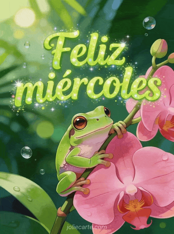Envía un saludo fresco de feliz miércoles con una adorable rana verde agarrada a una orquídea rosa brillante bajo una suave luz de selva tropical. Descubre también cada día pienso en ti yosa prod, corazón corazón ternura feliz miércoles besos o buenas noches y feliz miércoles.