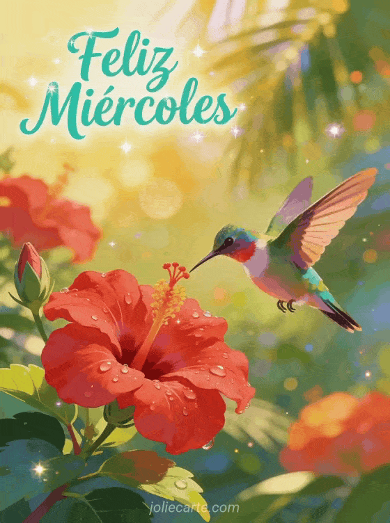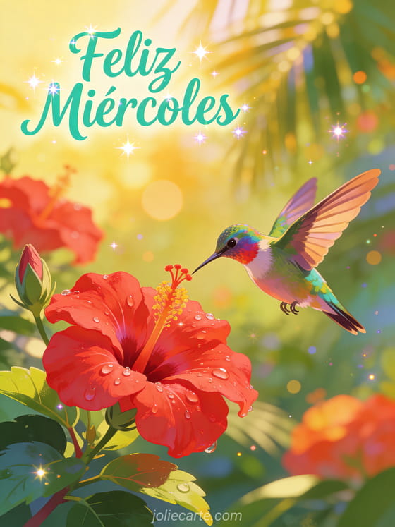 Comparta esta hermosa imagen de feliz miércoles con un colibrí multicolor revoloteando cerca de flores de hibisco rojas bañadas por la luz dorada del sol. Una tarjeta vibrante y tropical perfecta para alegrar el miércoles de alguien especial. Descubra también una tarjeta de buenos días miércoles o una tarjeta de feliz miercoles besos.