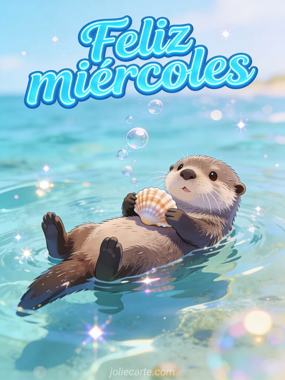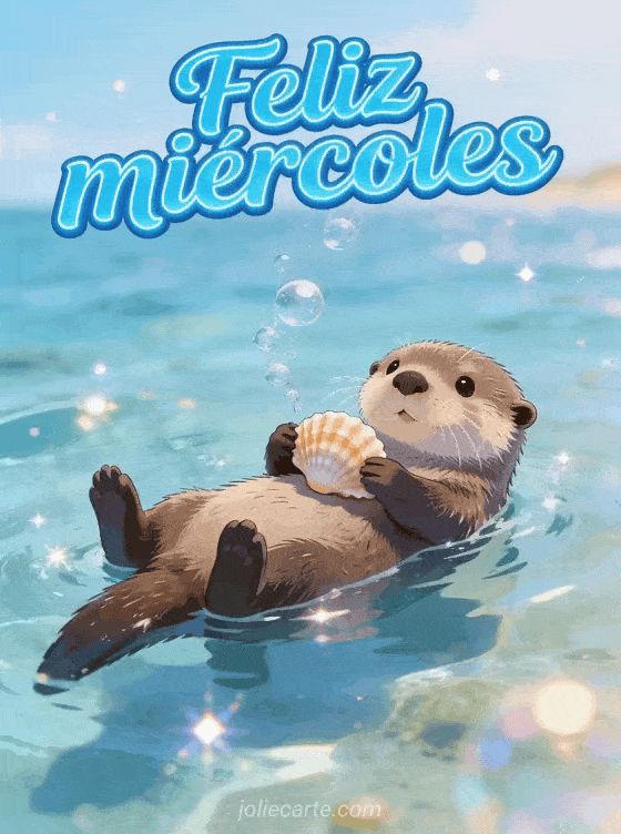 Envía un saludo gracioso de feliz miércoles con una nutria flotando boca arriba en agua clara, sosteniendo una concha entre burbujas y reflejos brillantes. Descubre también una feliz miércoles tarjeta animada, un gif de feliz miércoles soleado o un buenos días feliz miércoles gif animado.