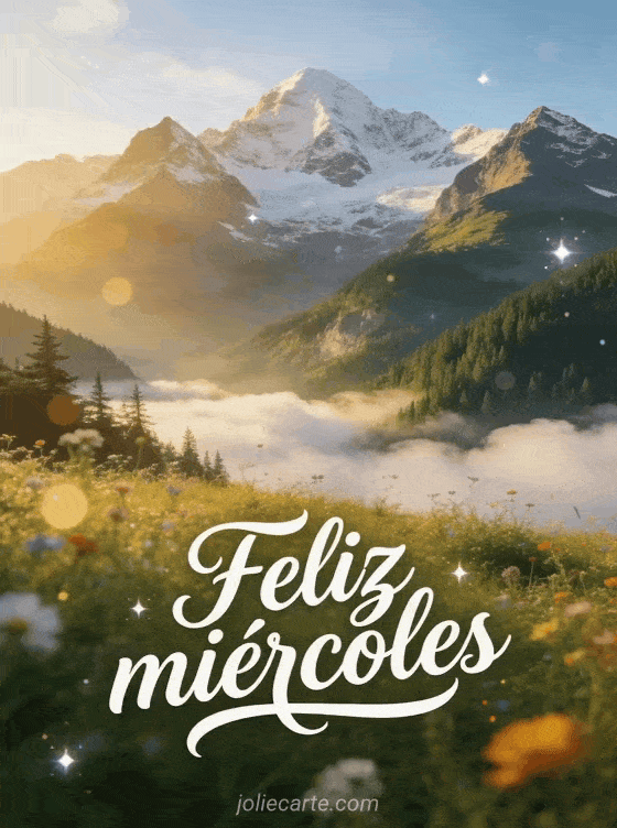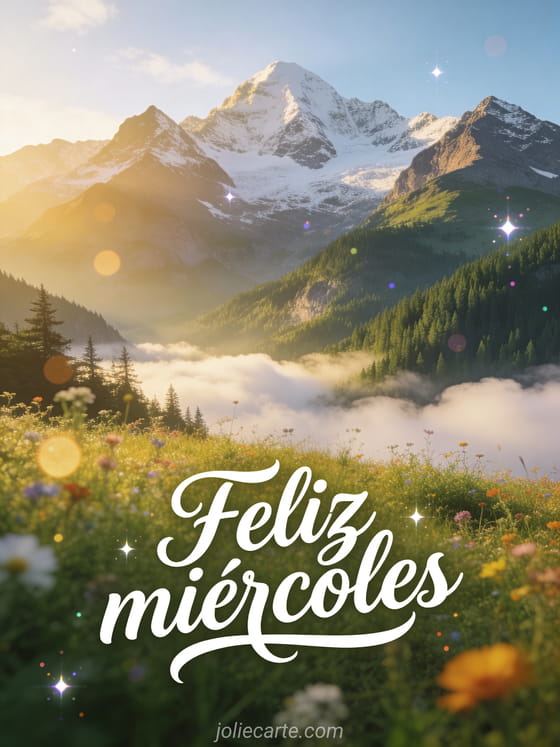 Envía un saludo tranquilo de feliz miércoles con cumbres alpinas nevadas, una pradera de flores silvestres y luz dorada de la mañana sobre nubes flotantes. Descubre también imágenes animadas feliz miércoles, buenos días es miércoles o buenos días mi hermosa miércoles.