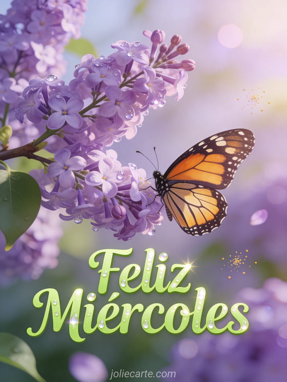 Celebra la primavera este miércoles con esta hermosa tarjeta de una mariposa monarca posada en lilas en flor con el brillo del rocío de la mañana. Descubre también una feliz miércoles a todos o una feliz miércoles beso.
