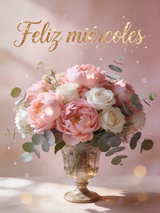 Envíen un romántico ramo de feliz miércoles con peonías rosadas, rosas blancas y eucalipto en un jarrón de vidrio vintage. Descubran también feliz miércoles besos gif animado, feliz miércoles gif de gato o feliz miércoles humor imagen graciosa.