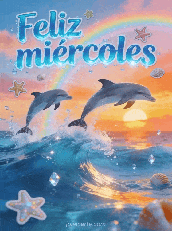 Envía un alegre saludo de feliz miércoles con letras azul océano, estrellas de mar, conchas, delfines saltando sobre olas brillantes, un arcoíris suave y un atardecer intenso. También pueden ver este gif de feliz miércoles soleado, este buenos días feliz miércoles gif animado o este perro animado beso gif feliz miércoles.