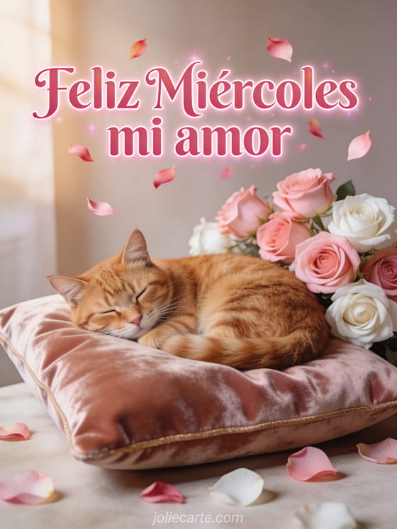 Comparte un amoroso deseo de feliz miércoles con esta tierna tarjeta romántica con un gato rojo dormido en un cojín de terciopelo rodeado de rosas. Descubre también feliz miércoles gif animado o gif animado beso feliz miércoles para más inspiración.