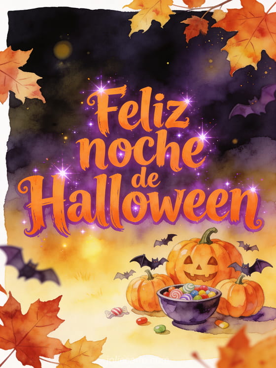 Comparte feliz noche de Halloween con letras naranja calabaza, calabazas alegres, pequeños murciélagos en acuarela alrededor de un tazón de caramelos y hojas de arce cruzando el borde. Descubre también feliz noche imágenes búsqueda, buenas noches gato imagen o besos de noche gif.