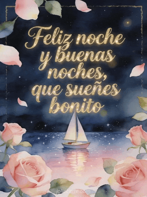 Comparte un mensaje de feliz noche y buenas noches con letras doradas fluidas, un pequeño velero en un lago tranquilo bajo estrellas, reflejos rosados y rosas rosadas. También puedes enviar un mensaje de buenas noches para tu enamorado, un mensaje tierno para decir buenas noches o un mensaje de buenas noches para tu amor.