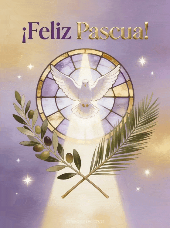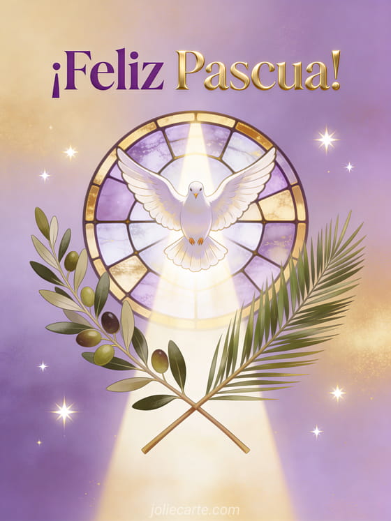Celebra la Pascua con esta elegante tarjeta religiosa con una paloma en un vitral, ramas de olivo y palma en tonos violeta y dorado. Descubre también una imagen de Pascua religiosa, tarjeta de Pascua religiosa o imagen de Pascua católica.