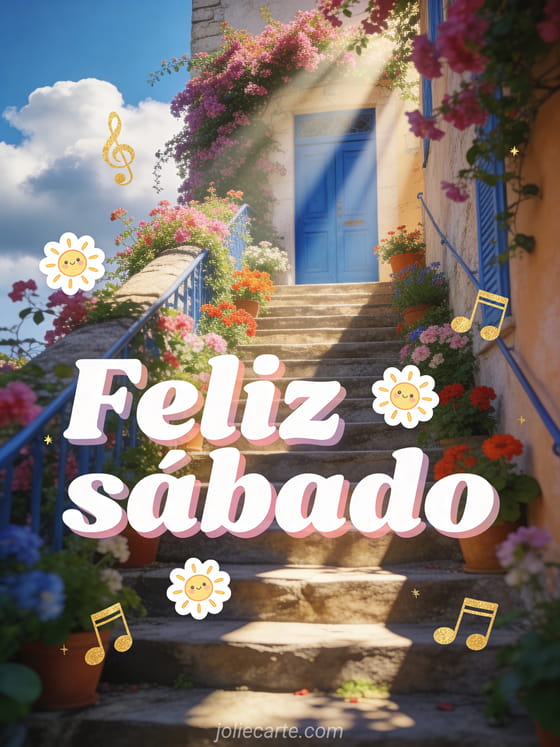 Envía feliz sábado amigos gifs con letras blancas alegres, pequeños soles, notas musicales doradas y una escalera florida hacia una puerta azul mediterránea. Comparte un deseo alegre de fin de semana y descubre también amistad feliz sábado buen fin de semana, buenos días feliz sábado besos o paisaje feliz sábado paisaje.