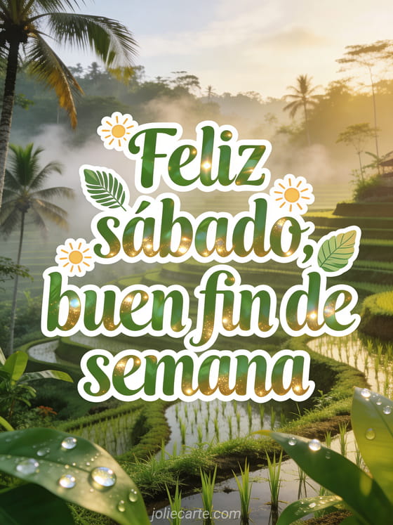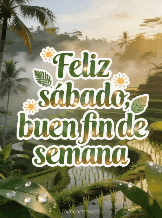 Desea a alguien un feliz sábado y un buen fin de semana con esta impresionante tarjeta tropical inspirada en Bali. También pueden interesarle una tarjeta feliz sábado gratis o gracias feliz sábado para más saludos de fin de semana.