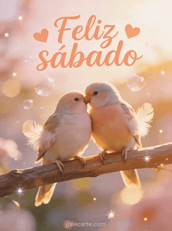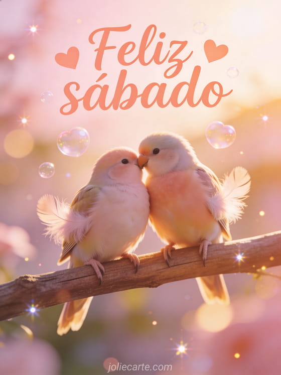 Comparte una imagen de feliz sábado besos con dos inseparables en una misma percha, rodeados de escritura color durazno y burbujas de corazones en una dulce escena de mañana. Envía más cariño de sábado con feliz sábado imagen gratis, tarjeta virtual gratis feliz sábado o buenos días sábado imagen.