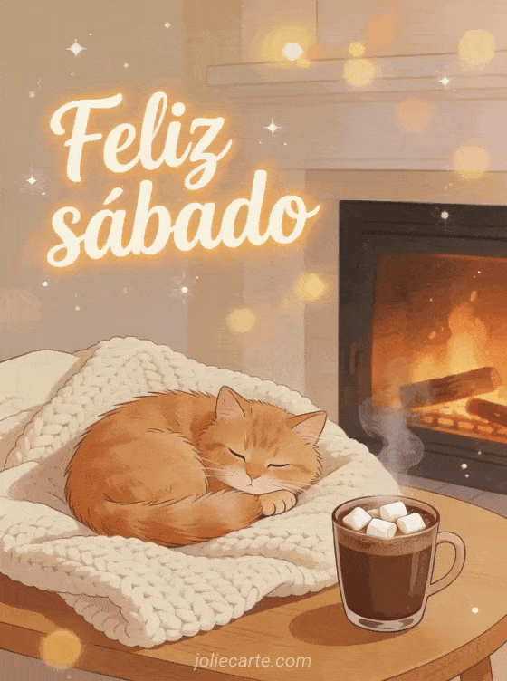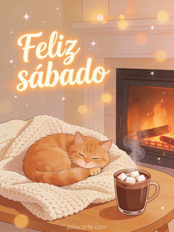 Envía un saludo acogedor de feliz sábado con un gato pelirrojo esponjoso acurrucado en una manta tejida junto a chocolate caliente con malvaviscos y luz de chimenea. Descubre también buenos días buen día feliz sábado, feliz sábado besos imagen o feliz sábado imagen gratis.