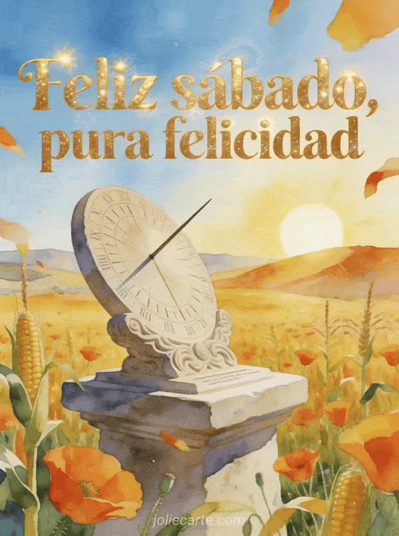 Envía un saludo alegre de feliz sábado con letras doradas radiantes, un reloj de sol tallado en una pradera de amapolas, luz cálida y colinas bañadas por el sol. También pueden compartir feliz sábado besos gif, feliz sábado mi amigo imagen o feliz sábado buen fin de semana gif.