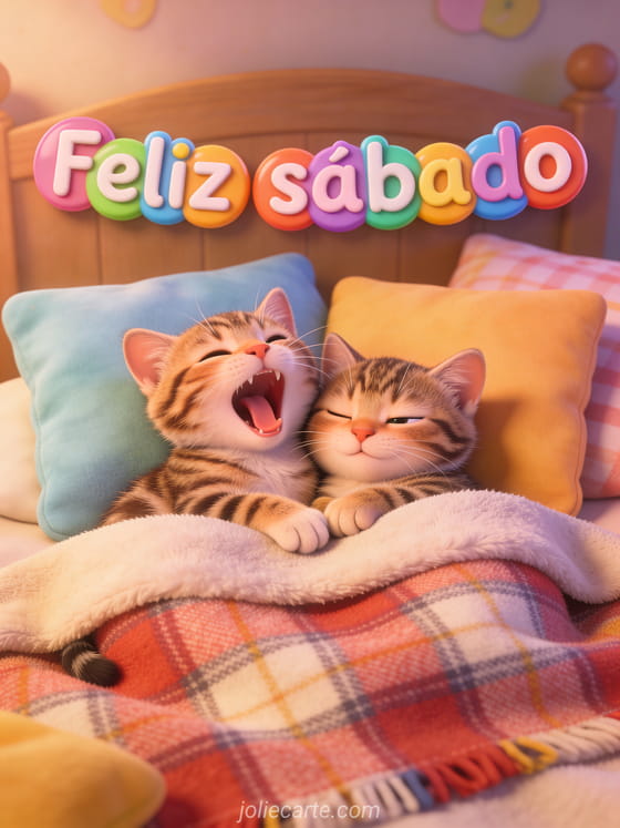 Comparte feliz sábado con los gatos en una ilustración 3D cálida con letras redondas coloridas, dos adorables gatitos atigrados abrazados sobre un plaid acogedor, cojines suaves y luz suave de mañana. Descubre también imágenes de besos del sábado o feliz sábado por la noche besos.