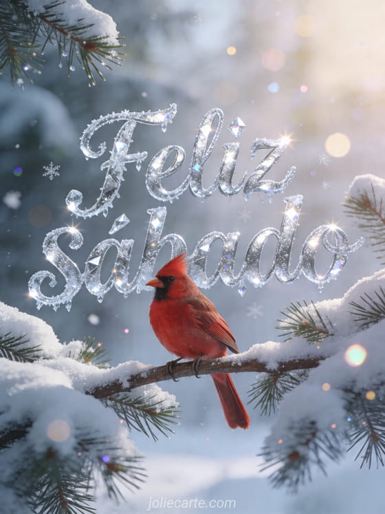 Envía una hermosa tarjeta de Feliz sábado con ramas nevadas y un cardenal rojo para un ambiente acogedor. Descubre también feliz sábado besos flores, feliz sábado café besos y feliz sábado y buen fin de semana.