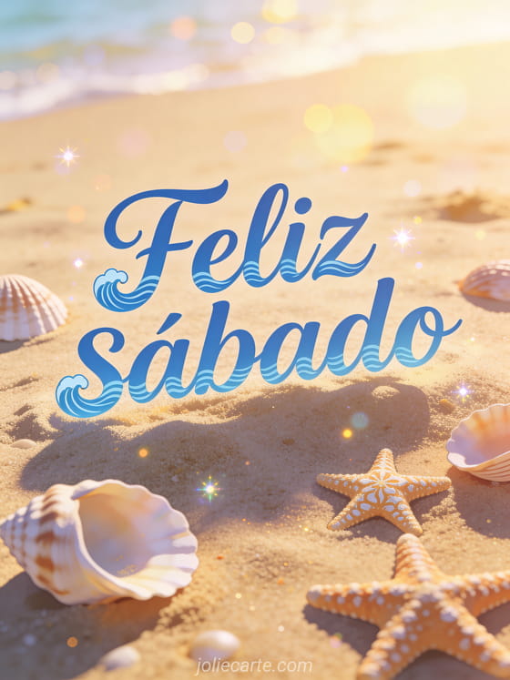 Comparte feliz sábado feliz fin de semana con conchas marinas y estrellas de mar sobre una playa de arena en una escena tranquila de mañana costera. Lleva más alegría al fin de semana con buenos días feliz sábado gifs animados, feliz sábado smiley o feliz sábado con los gatos.