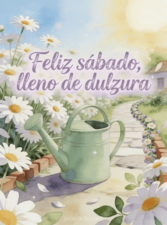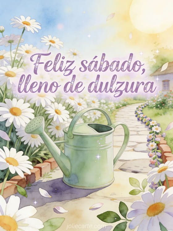 Comparte un mensaje dulce de sábado con una regadera verde pálido, abundantes margaritas blancas y un sendero florido en un jardín soleado. También puedes enviar imágenes brillantes feliz sábado, una imagen para desear un feliz sábado o feliz sábado gifs brillantes.