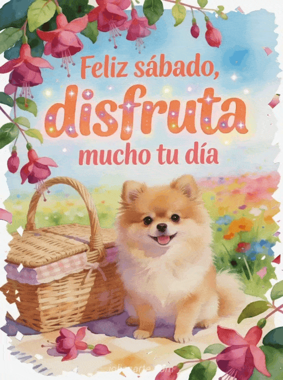 Comparte un gif animado de feliz sábado con letras coral, un Pomerania miniatura, una cesta de picnic de mimbre y flores fucsias colgantes sobre una pradera viva. También puedes enviar muy feliz sábado gif, imágenes gratis feliz sábado y buen fin de semana o feliz sábado y fin de semana imagen.