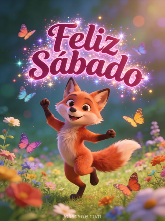 Comparte un saludo divertido de feliz sábado con un zorro lindo bailando alegremente en un prado de flores silvestres, rodeado de mariposas de colores y con estilo 3D de caricatura. Descubre también buenos días sábado imágenes bonitas, una imagen de feliz sábado muchos besos o buenos días feliz sábado.