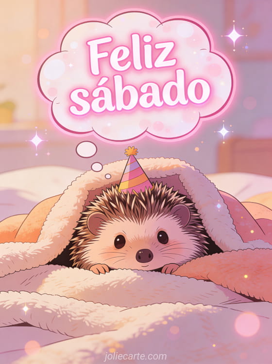Comparte una hilarante tarjeta de feliz sábado con humor con un adorable erizo con sombrero de fiesta asomándose de un montón de mantas acogedoras. La tarjeta perfecta para la mañana perezosa de fin de semana. Descubre también una tarjeta feliz sábado paisaje o una tarjeta imágenes feliz sábado.