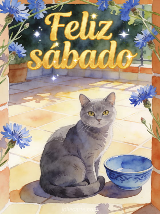 Comparte un mensaje alegre de feliz sábado con un gato azul ruso, un cuenco de cerámica azul, acianos luminosos y una terraza soleada con azulejos. También puedes enviar una hermosa imagen para feliz sábado y buen fin de semana, una feliz sábado nieve imagen o feliz sábado gifs animados.