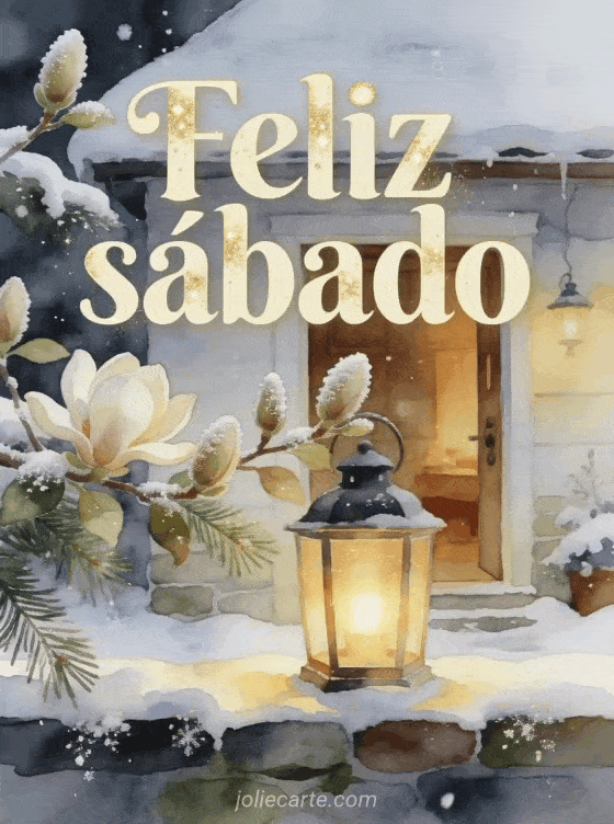 Envía un saludo cálido de feliz sábado con una entrada de cabaña cubierta de nieve, una linterna encendida y brotes de magnolia helados. Descubre también buenos días y feliz sábado gifs, feliz sábado mi amiga imagen o feliz sábado romántico imagen.