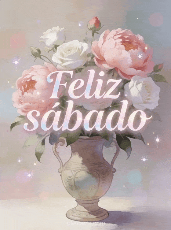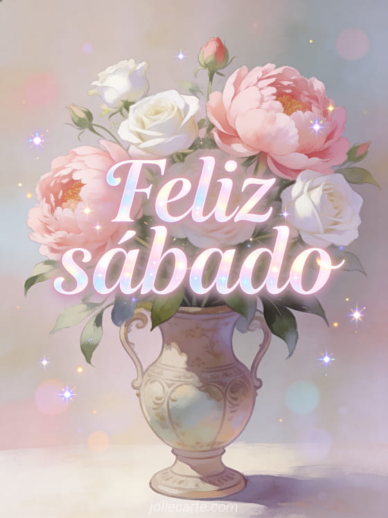 Comparte un saludo refinado de feliz sábado con un ramo de peonías rosas y rosas blancas en un jarrón vintage, bañado por una suave luz de mañana. Descubre también una feliz sábado otoñal imagen, feliz sábado soleado imágenes o una feliz sábado mis amigas imagen.