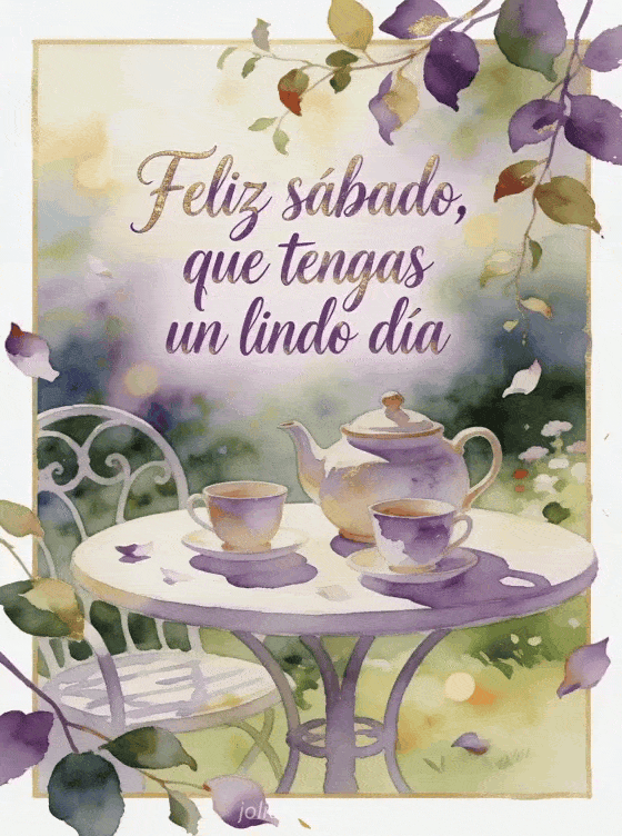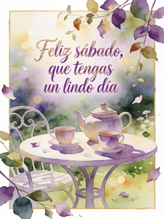 Envía un saludo amigable de sábado con una tetera de cerámica, dos tazas pintadas y una mesa redonda de jardín con luz cálida. Descubre también feliz sábado romántico imagen, feliz sábado feliz fin de semana imágenes o sábado buenos días gif.
