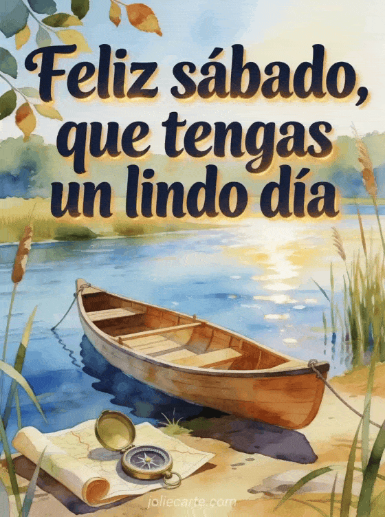 Envía un saludo amigable de feliz sábado con letras azul marino, una canoa de madera en una orilla soleada, una brújula, un mapa doblado, juncos y hojas luminosas. También pueden compartir feliz sábado buen fin de semana gif, feliz sábado imágenes animadas o hermosa imagen para feliz sábado y buen fin de semana.