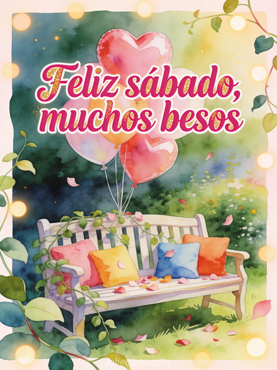 Comparte feliz sábado y muchos besos con una tarjeta de acuarela que muestra un banco de jardín con cojines coloridos, globos en forma de corazón, pétalos y enredaderas. Descubre también una tarjeta de imagen gratis buenos días sábado, feliz sábado y buen fin de semana gif animado o bellas imágenes de feliz sábado.