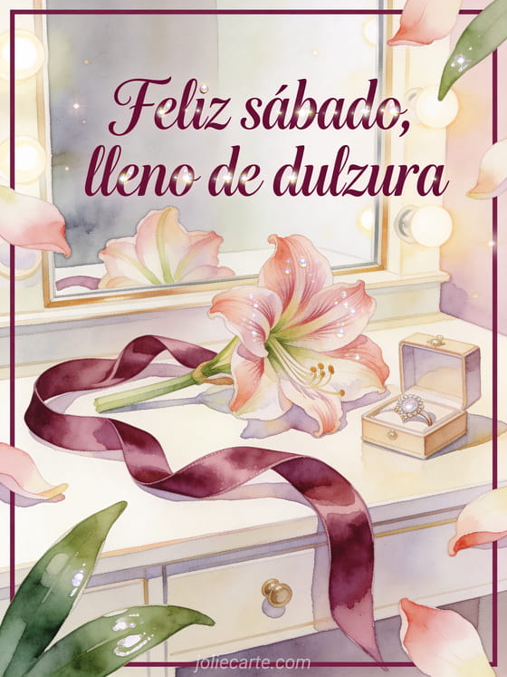 Envía un deseo suave de sábado con una flor de amarilis, una cinta satinada, un pequeño joyero y un tocador luminoso. Descubre también feliz sábado muchos besos gifs, feliz sábado por la noche gifs o feliz sábado nieve gif.