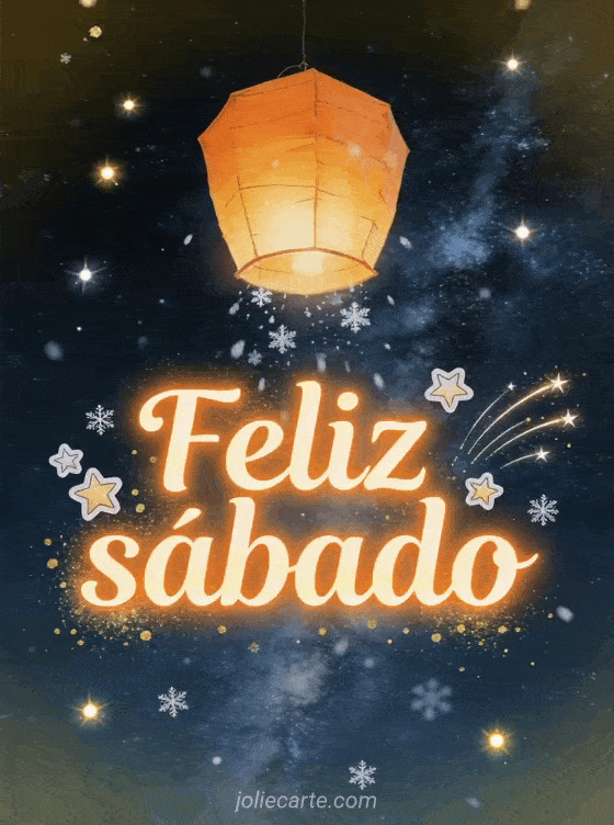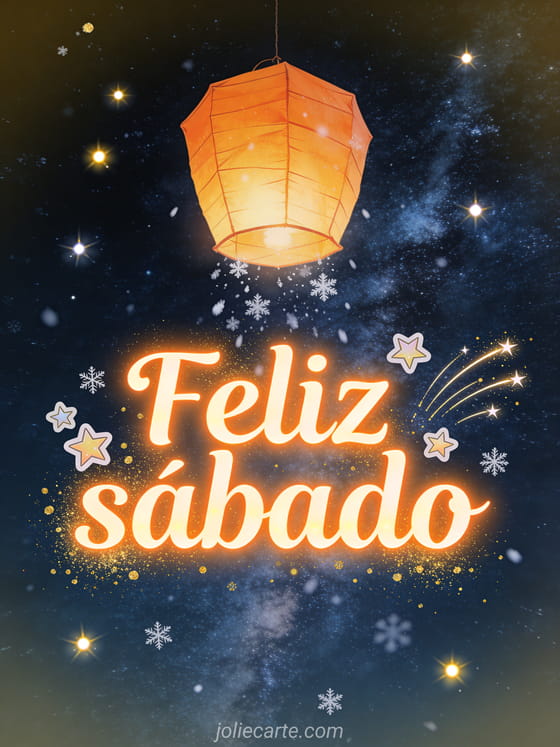 Envíen una tarjeta mágica de feliz sábado por la noche con letras naranjas luminosas, estrellas fugaces, polvo dorado y una linterna de papel naranja flotando en una noche nevada y estrellada bajo la Vía Láctea. Descubran también feliz sábado soleado, feliz sábado feliz fin de semana imágenes o feliz sábado y buen fin de semana.