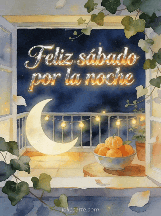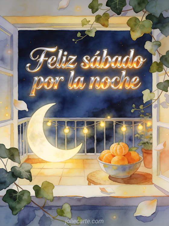 Desea feliz sábado por la noche con una luna creciente sobre una terraza acogedora, luces brillantes, un cuenco de mandarinas y hiedra suave en colores nocturnos de acuarela. Comparte esta tarjeta apacible y descubre también feliz sábado nieve gif, sábado que tengas un buen día gif o feliz sábado besos imágenes.