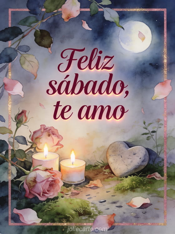 Comparte feliz sábado, te amo con una escena tierna en acuarela de dos pequeñas velas, rosas antiguas y una piedra con forma de corazón en un rincón de jardín bajo la luna. También pueden enviar feliz sábado feliz fin de semana imágenes, un sábado buenos días gif o una feliz sábado con el sol imagen.