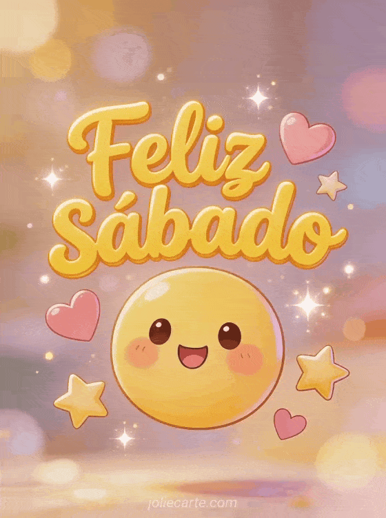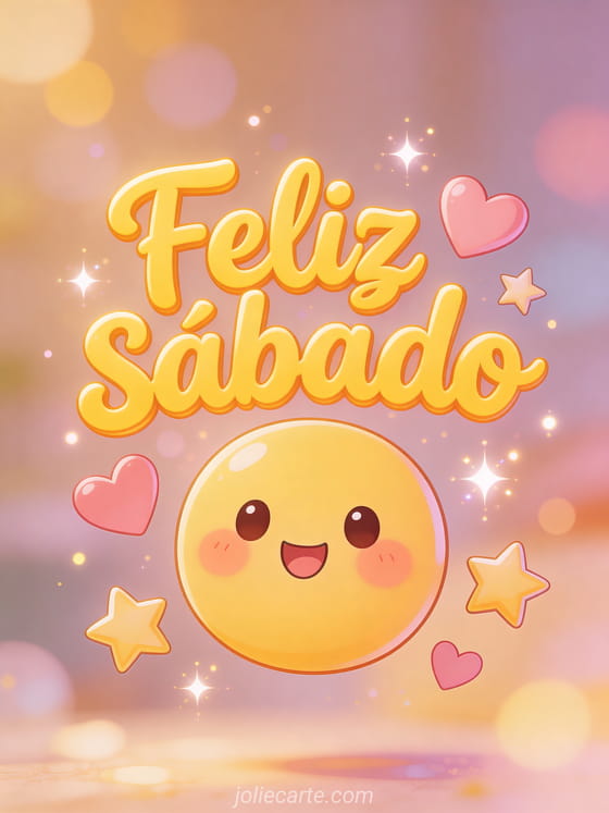 Comparte un saludo positivo de feliz sábado con un personaje smiley kawaii lindo, mejillas rosadas, corazones y estrellas flotando, y un ambiente muy alegre. Descubre también feliz sábado con los gatos, imágenes de besos del sábado o feliz sábado por la noche besos.